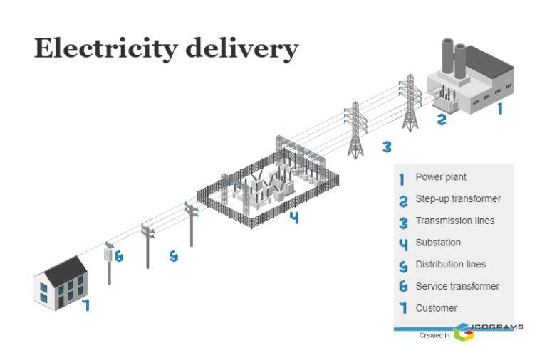 Electricity delivery involves a series of steps to bring power from a power plant to our homes and businesses. It all begins at the power plant, where electricity is generated. This electricity is in a low voltage form, which is not suitable for long-distance transportation. To make it suitable for transmission, a step-up transformer is used. This device increases the voltage, reducing energy loss during transmission.